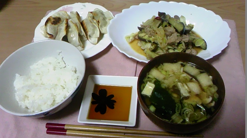 ・夕食 なすと豚肉のみそぽん炒め250円、チルド肉餃子50円、味噌汁50円